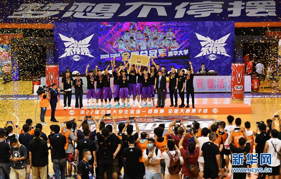 8月29日,清华大学队球员和教练在领奖台上庆祝夺冠。 当日,第22届中国大学生篮球联赛(CUBA)一级联赛(男子组)全国总决赛在福建省泉州市举行。清华大学队最终以83比75击败中南大学队,夺得总决赛冠军。 新华社记者魏培全摄