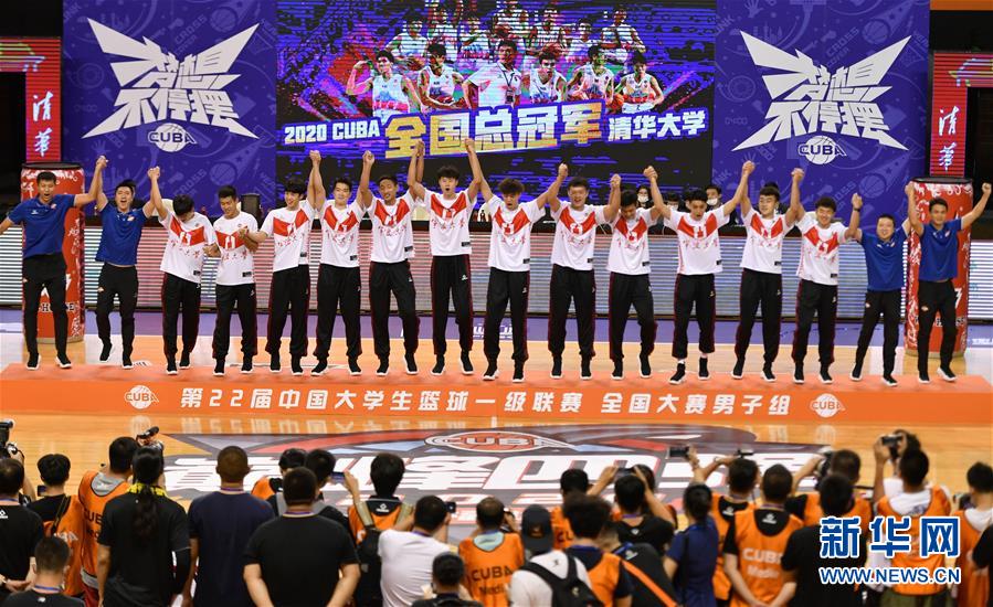 8月29日,季军宁波大学队球员和教练在领奖台上庆祝。 当日,第22届中国大学生篮球联赛(CUBA)一级联赛(男子组)全国总决赛在福建省泉州市举行。清华大学队最终以83比75击败中南大学队,夺得总决赛冠军。 新华社记者魏培全摄