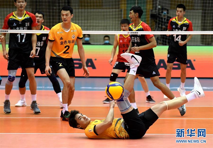 8月29日,上海金色年华队球员武弸智(下)在比赛中。 当日,在河北秦皇岛进行的2019-2020赛季中国男子排球超级联赛第三阶段半决赛中,上海金色年华队以3比1战胜山东体彩队。 新华社记者 王晓 摄