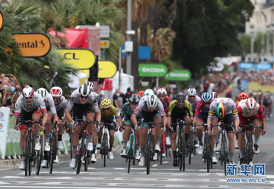 8月29日,阿联酋航空车队挪威车手亚历山大·克里斯托弗(左一)在比赛中。 当日,2020年环法自行车赛在法国尼斯开赛。首个赛段全长156公里,在法国南部著名旅游城市尼斯进行。阿联酋航空车队的挪威车手亚历山大·克里斯托弗以3小时46分13秒成为首个赛段的冠军。 新华社/法新