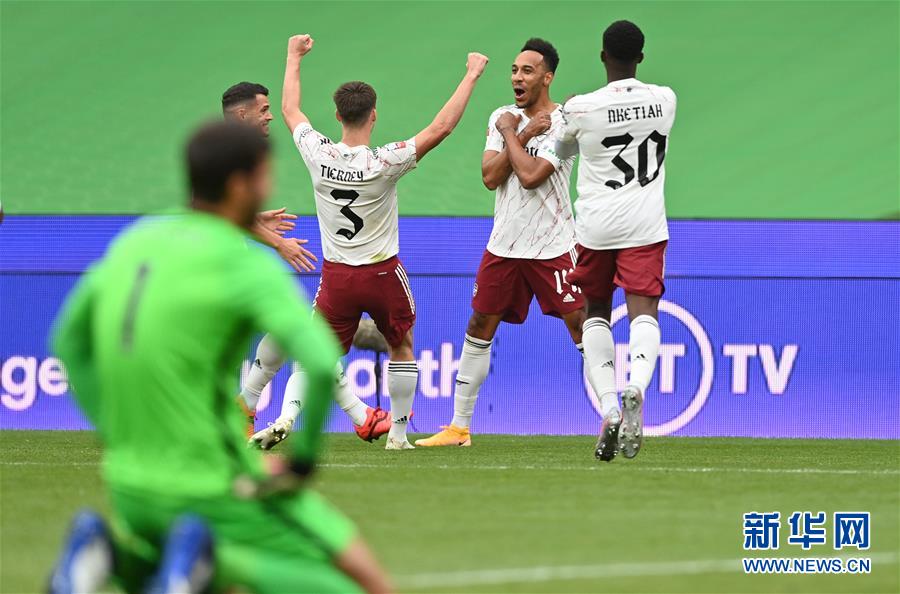 8月29日,阿森纳队球员奥巴梅扬(右二)在进球后和队友庆祝。 当日,在2020英格兰社区盾杯足球赛中,阿森纳队与利物浦队在90分钟内战成1比1平,经过点球大战,阿森纳队以6比5的总比分战胜利物浦队,获得冠军。 新华社/路透