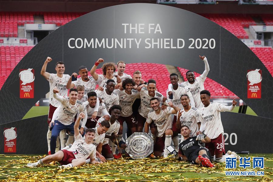 8月29日,阿森纳队球员在颁奖仪式上庆祝。 当日,在2020英格兰社区盾杯足球赛中,阿森纳队与利物浦队在90分钟内战成1比1平,经过点球大战,阿森纳队以6比5的总比分战胜利物浦队,获得冠军。 新华社/路透