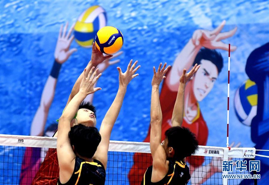 8月30日,天津食品集团队球员刘金浩(上)在比赛中扣球。 当日,在河北秦皇岛进行的2019-2020赛季中国男子排球超级联赛第四阶段九、十名决赛中,天津食品集团队以2比3不敌广东深圳宝安明金海队。 新华社记者 王晓 摄