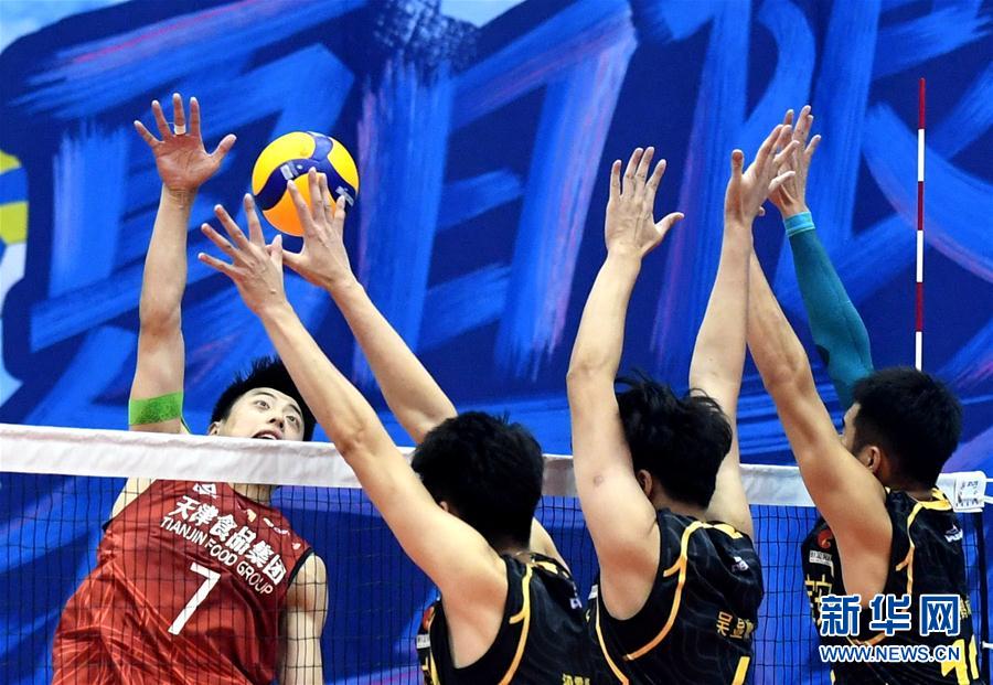 8月30日,天津食品集团队球员刘金浩(左一)在比赛中扣球。 当日,在河北秦皇岛进行的2019-2020赛季中国男子排球超级联赛第四阶段九、十名决赛中,天津食品集团队以2比3不敌广东深圳宝安明金海队。 新华社记者 王晓 摄