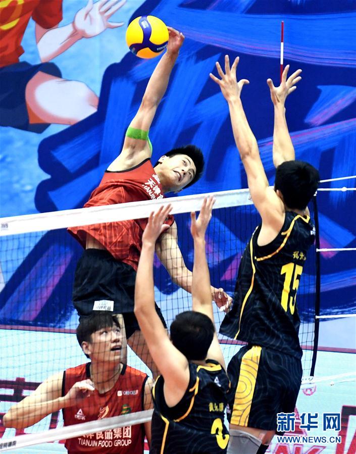 8月30日,天津食品集团队球员刘金浩(左上)在比赛中扣球。 当日,在河北秦皇岛进行的2019-2020赛季中国男子排球超级联赛第四阶段九、十名决赛中,天津食品集团队以2比3不敌广东深圳宝安明金海队。 新华社记者 王晓 摄