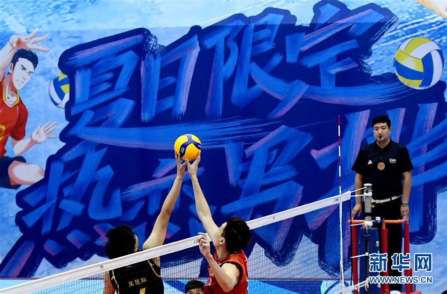 8月30日,广东深圳宝安明金海队球员吴显顺(左)在网前争抢。 当日,在河北秦皇岛进行的2019-2020赛季中国男子排球超级联赛第四阶段九、十名决赛中,天津食品集团队以2比3不敌广东深圳宝安明金海队。 新华社记者 王晓 摄