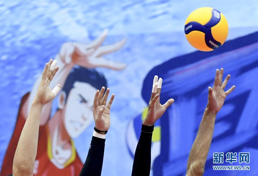 8月30日,河北海瑞队球员在比赛中拦网。 当日,在河北秦皇岛进行的2019-2020赛季中国男子排球超级联赛第四阶段十一、十二名决赛中,河北海瑞队以3比1战胜湖北队。 新华社记者 王晓 摄
