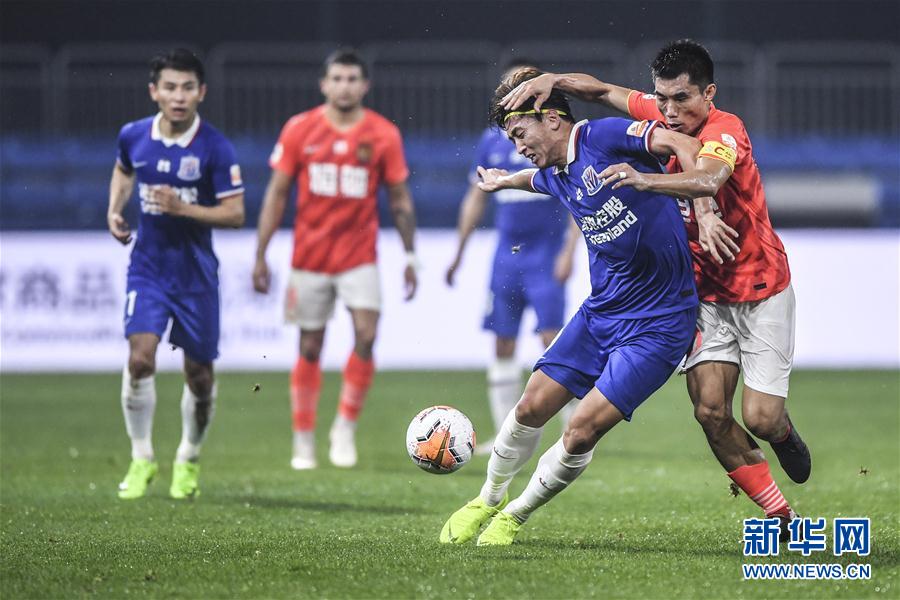 8月30日,上海绿地申花队球员杨旭(前左)与广州恒大淘宝队球员郑智(前右)拼抢。 当日,在2020赛季中国足球协会超级联赛第一阶段(大连赛区)第八轮比赛中,广州恒大淘宝队以4比1战胜上海绿地申花队。 新华社记者潘昱龙摄