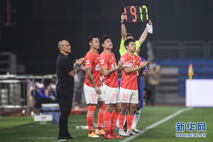 8月30日,广州恒大淘宝队主教练卡纳瓦罗(左)在比赛中进行换人调整。 当日,在2020赛季中国足球协会超级联赛第一阶段(大连赛区)第八轮比赛中,广州恒大淘宝队以4比1战胜上海绿地申花队。 新华社记者潘昱龙摄