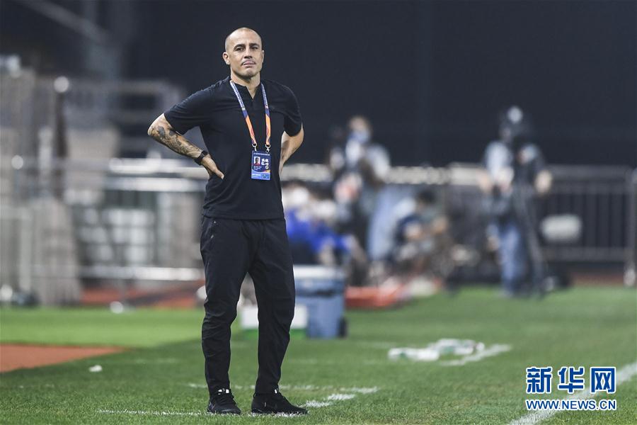 8月30日,广州恒大淘宝队主教练卡纳瓦罗在场边观战。 当日,在2020赛季中国足球协会超级联赛第一阶段(大连赛区)第八轮比赛中,广州恒大淘宝队以4比1战胜上海绿地申花队。 新华社记者潘昱龙摄
