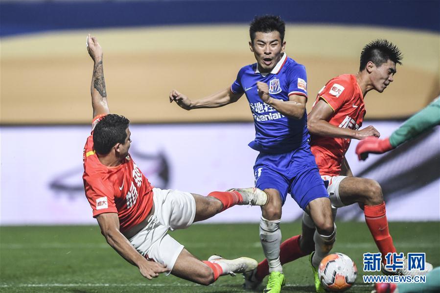 8月30日,广州恒大淘宝队球员艾克森(左)在比赛中拼抢。 当日,在2020赛季中国足球协会超级联赛第一阶段(大连赛区)第八轮比赛中,广州恒大淘宝队以4比1战胜上海绿地申花队。 新华社记者潘昱龙摄