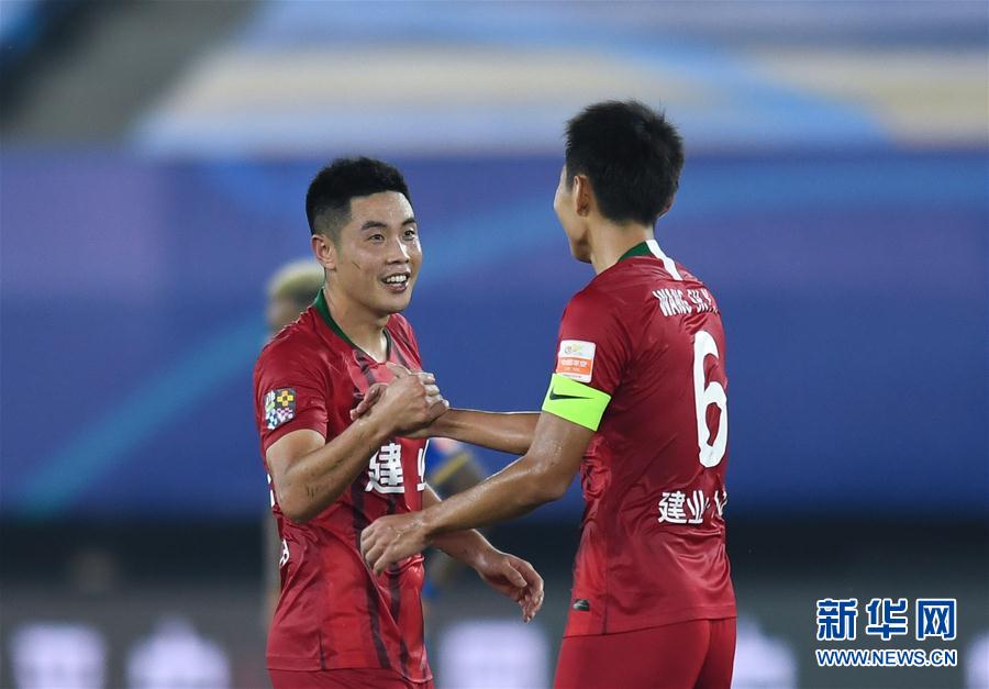 8月30日,河南建业队球员倪玉崧(左)进球后与队友王上源庆祝。 当日,在2020赛季中国足球协会超级联赛第一阶段(大连赛区)第八轮比赛中,江苏苏宁易购队以5比2战胜河南建业队。 新华社记者 龙雷 摄