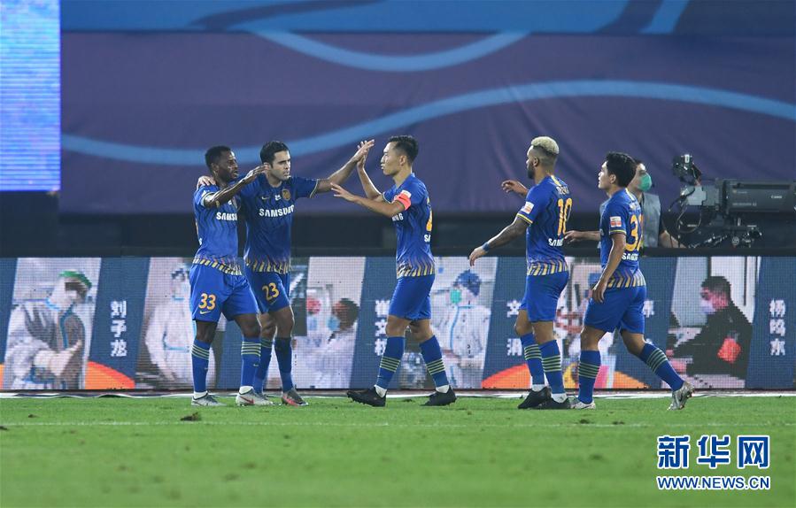 8月30日,江苏苏宁易购队球员埃德尔(左二)进球后与队友庆祝。 当日,在2020赛季中国足球协会超级联赛第一阶段(大连赛区)第八轮比赛中,江苏苏宁易购队以5比2战胜河南建业队。 新华社记者 龙雷 摄