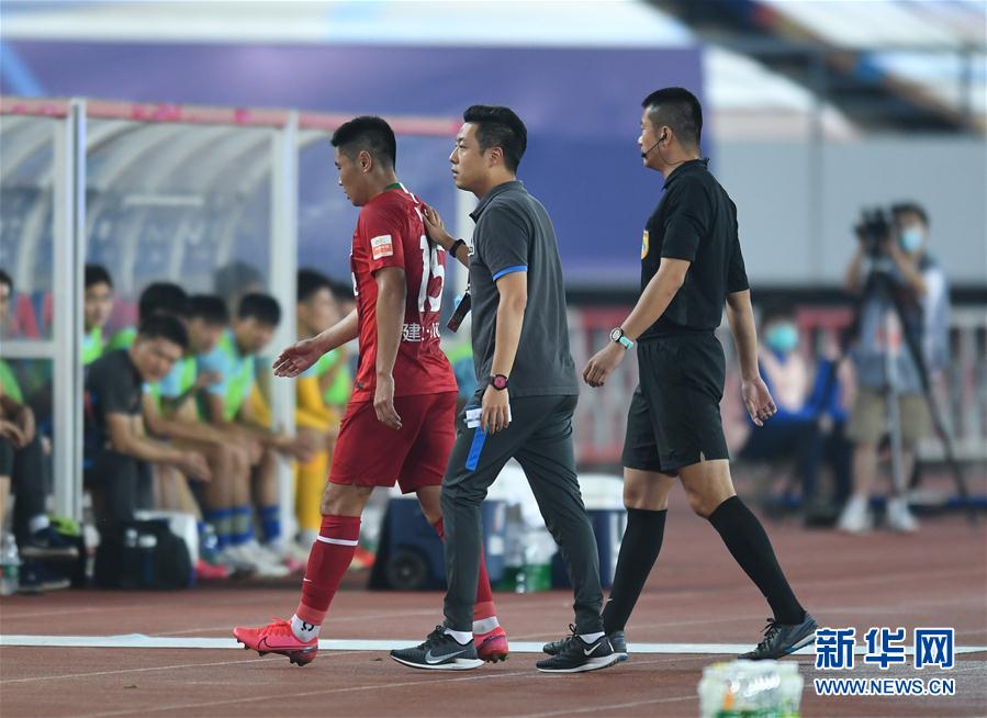 8月30日,河南建业队球员倪玉崧(左)被红牌罚下后离开场地。 当日,在2020赛季中国足球协会超级联赛第一阶段(大连赛区)第八轮比赛中,江苏苏宁易购队以5比2战胜河南建业队。 新华社记者 龙雷 摄