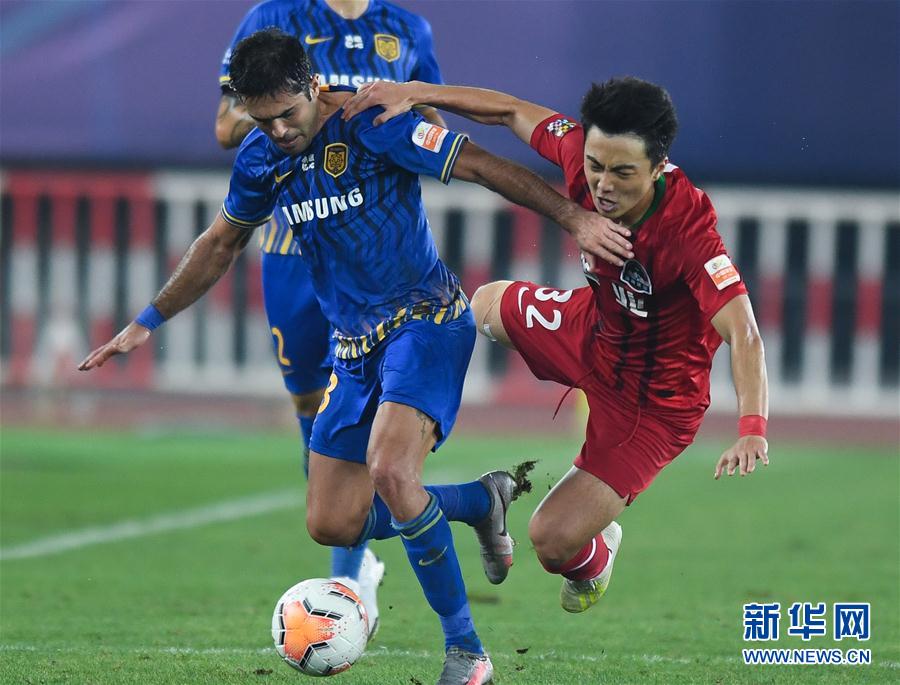8月30日,江苏苏宁易购队球员埃德尔(前左)与河南建业队球员袁野拼抢。 当日,在2020赛季中国足球协会超级联赛第一阶段(大连赛区)第八轮比赛中,江苏苏宁易购队以5比2战胜河南建业队。 新华社记者 龙雷 摄