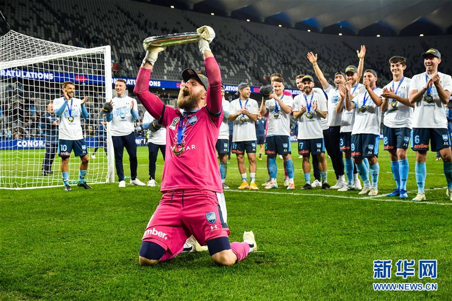 8月30日,悉尼FC队守门员安德鲁·雷德梅因(前)高举冠军奖杯庆祝夺冠。 当日,澳大利亚超级联赛总决赛在西悉尼体育场打响。经过120分钟激战,卫冕冠军悉尼FC队以1比0击败墨尔本城队,成功创造历史,成为澳超首个“五冠王”。 新华社发(基思·麦金尼斯摄)