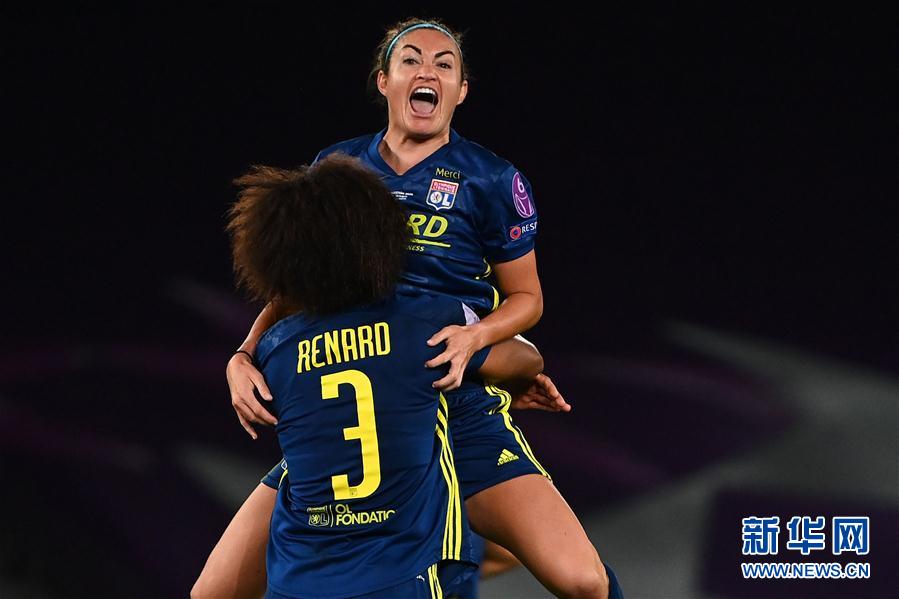 8月30日,里昂队球员泰勒(上)和队友雷纳德赛后庆祝夺冠。 当日,在2019-2020赛季女足欧冠决赛中,法甲里昂队以3比1击败德甲沃尔夫斯堡队,夺得冠军。 新华社/法新