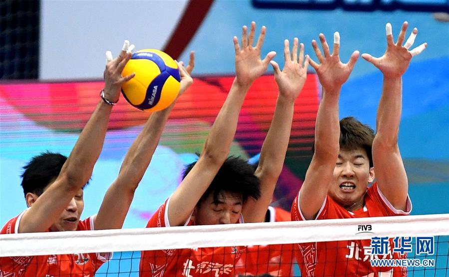 8月31日,北京汽车队球员江川(左)、王东宸(中)和刘力宾在比赛中拦网。 当日,在河北秦皇岛进行的2019-2020赛季中国男子排球超级联赛第四阶段五、六名决赛中,北京汽车队以3比0战胜四川劲浪体育队,获得第五名。 新华社记者王晓摄