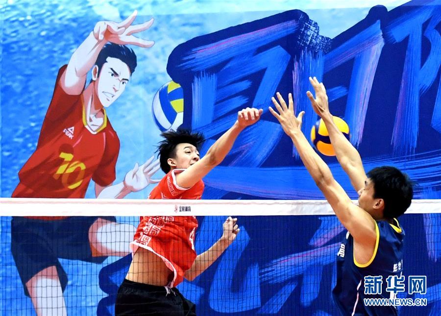 8月31日,北京汽车队球员王东宸(左)在比赛中扣球。 当日,在河北秦皇岛进行的2019-2020赛季中国男子排球超级联赛第四阶段五、六名决赛中,北京汽车队以3比0战胜四川劲浪体育队,获得第五名。 新华社记者王晓摄