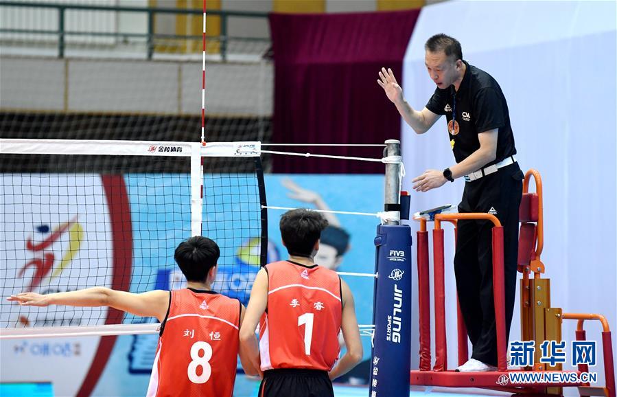 8月31日,河南队球员刘恒(左)在比赛中与裁判交流。 当日,在河北秦皇岛进行的2019-2020赛季中国男子排球超级联赛第四阶段七、八名决赛中,福建师范大学队以3比0战胜河南队。 新华社记者王晓摄