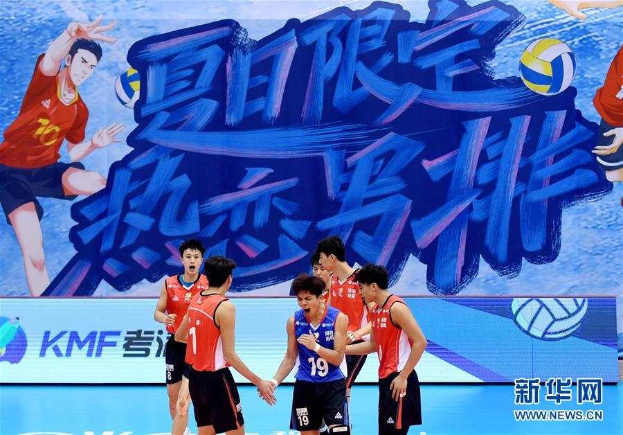 8月31日,河南队球员祁嘉豪(中)在得分后庆祝。 当日,在河北秦皇岛进行的2019-2020赛季中国男子排球超级联赛第四阶段七、八名决赛中,福建师范大学队以3比0战胜河南队。 新华社记者王晓摄