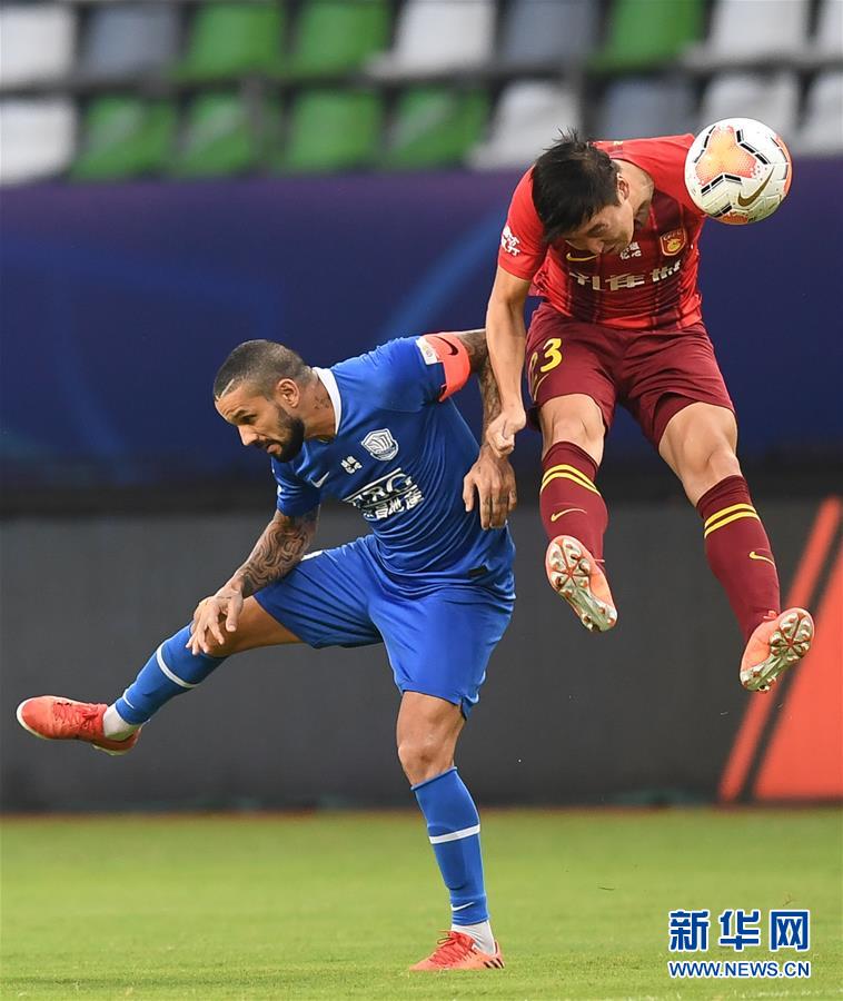 8月31日,石家庄永昌队球员马修斯(左)与河北华夏幸福队球员任航在比赛中争顶。 当日,在2020赛季中国足球协会超级联赛第一阶段(苏州赛区)第八轮比赛中,石家庄永昌队以3比1战胜河北华夏幸福队。 新华社记者季春鹏摄