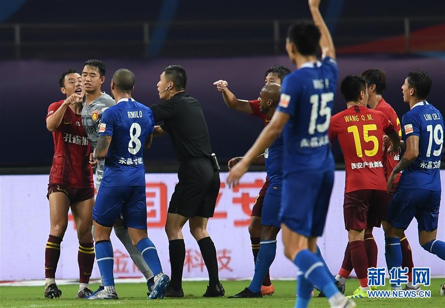 8月31日,双方队员在比赛中发生争执。 当日,在2020赛季中国足球协会超级联赛第一阶段(苏州赛区)第八轮比赛中,石家庄永昌队以3比1战胜河北华夏幸福队。 新华社记者季春鹏摄
