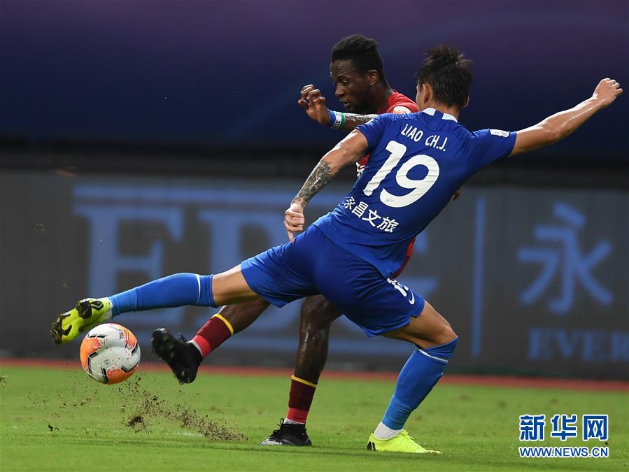 8月31日,石家庄永昌队球员廖承坚(前)在比赛中防守河北华夏幸福队球员图雷。 当日,在2020赛季中国足球协会超级联赛第一阶段(苏州赛区)第八轮比赛中,石家庄永昌队以3比1战胜河北华夏幸福队。 新华社记者季春鹏摄