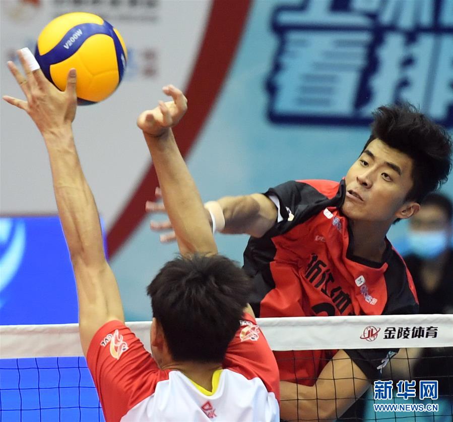 8月31日,浙江体彩队球员张景胤(右)在比赛中扣球。 当日,在河北秦皇岛进行的2019-2020赛季中国男子排球超级联赛第四阶段三、四名决赛中,浙江体彩队以1比3不敌山东体彩队,获得第四名。 新华社记者朱旭东摄