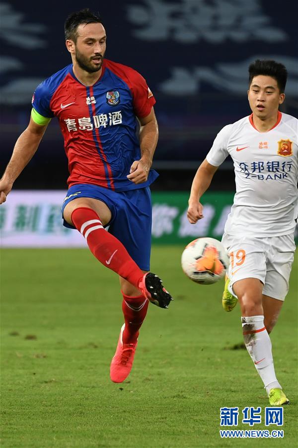 9月1日,青岛黄海青港队球员武科维奇(左)在比赛中传球。 当日,在2020赛季中国足球协会超级联赛第一阶段(苏州赛区)第八轮比赛中,青岛黄海青港队对阵武汉卓尔队。 新华社记者韩瑜庆摄
