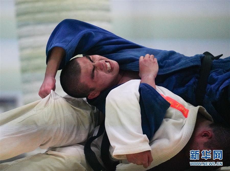 队员罗中龙(上)和队友在训练馆进行对抗训练(8月26日摄)。 新华社记者胡晨欢摄