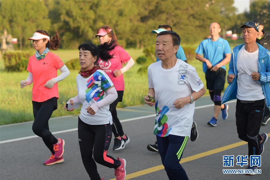 9月1日,韩秉善(前右)、马丽君(前中)与跑友们在赛汗塔拉城中草原跑步。 韩秉善和马丽君家住内蒙古自治区包头市青山区大连新型住宅区温馨园,丈夫韩秉善今年69岁,妻子马丽君今年64岁。2015年起,老两口开始相伴奔跑的“旅程”。 虽已六十多岁,当换上运动装备跑步,老两口则能释放出无限活力。2017年,韩秉善和马丽君参加了第一个半程马拉松赛事——鄂尔多斯国际马拉松。之后,他们陆续参加了多个马拉松赛事,收获多枚奖牌。 2019年是韩秉善和马丽君结婚40周年,他们穿着女儿手绘图案的服装参加了兰州国际马拉松赛,以别样的方式纪念甜蜜的爱情。 不被年龄设限,老两口以跑步的方式锻炼身体,挑战自我。“我跑步,我健康,我快乐,只要能跑动,我俩就彼此陪伴,一直跑下去。”韩秉善说。 新华社记者李志鹏摄