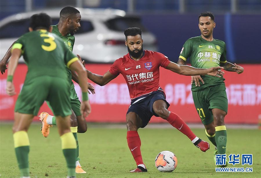 9月1日,重庆当代队球员费尔南迪尼奥(右二)在比赛中突破。 当日,在2020赛季中国足球协会超级联赛第一阶段(苏州赛区)第八轮比赛中,北京中赫国安队以5比2战胜重庆当代队。 新华社记者季春鹏摄