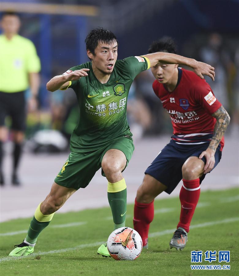 9月1日,北京中赫国安队球员李磊(左)在比赛中控球。 当日,在2020赛季中国足球协会超级联赛第一阶段(苏州赛区)第八轮比赛中,北京中赫国安队以5比2战胜重庆当代队。 新华社记者季春鹏摄