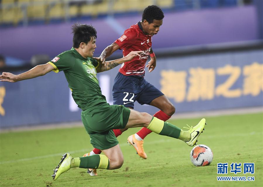 9月1日,北京中赫国安队球员金玟哉(左)在比赛中防守重庆当代队球马尔西尼奥。 当日,在2020赛季中国足球协会超级联赛第一阶段(苏州赛区)第八轮比赛中,北京中赫国安队以5比2战胜重庆当代队。 新华社记者季春鹏摄