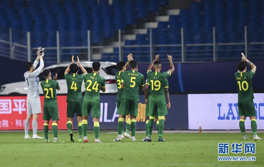 9月1日,北京中赫国安队球员在赛后向球迷致意。 当日,在2020赛季中国足球协会超级联赛第一阶段(苏州赛区)第八轮比赛中,北京中赫国安队以5比2战胜重庆当代队。 新华社记者季春鹏摄