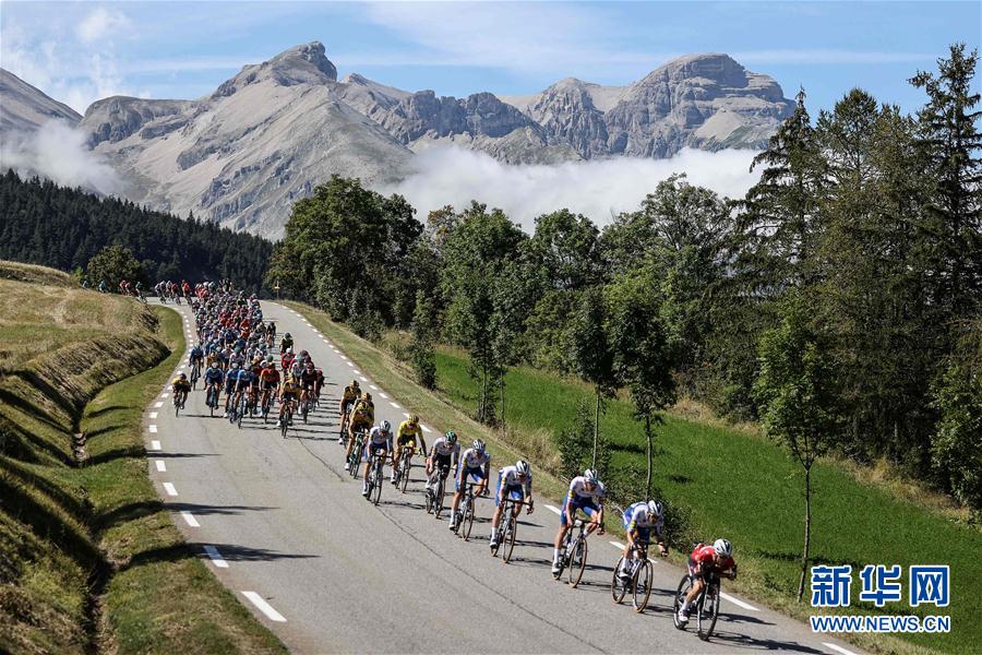 9月1日,参赛车手在比赛中骑行。 当日,2020环法自行车赛进行了第四赛段从西斯特龙到奥西耶尔的比赛,这是本届赛事的第一个丘陵赛段。最终,珍宝车队斯洛文尼亚车手罗格利奇获得赛段冠军,快步车队法国车手阿拉菲利普继续保有黄色领骑衫。 新华社/法新