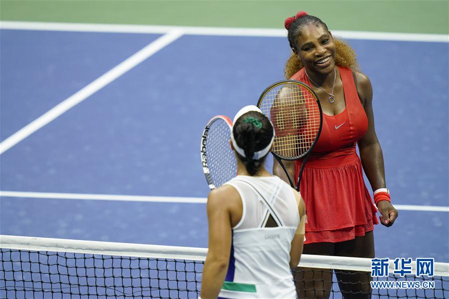 9月1日,小威(上)和克丽丝蒂·安赛后致意。 当日,在2020美国网球公开赛女子单打首轮比赛中,美国选手塞雷娜·威廉姆斯以2比0战胜同胞克丽丝蒂·安,晋级下一轮。 新华社/美联