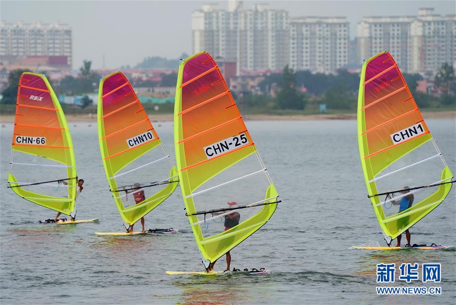 9月2日,四川队选手高梦凡(左二)在男子RS:X级帆板比赛中,他最终获得冠军。 当日,在河北省秦皇岛市北戴河新区海域举行的2020年全国帆板锦标赛男子RS:X级比赛中,四川队选手高梦凡夺得冠军,浙江队选手陈昊获得亚军,福建队选手叶兵获得季军。 新华社记者 杨世尧 摄