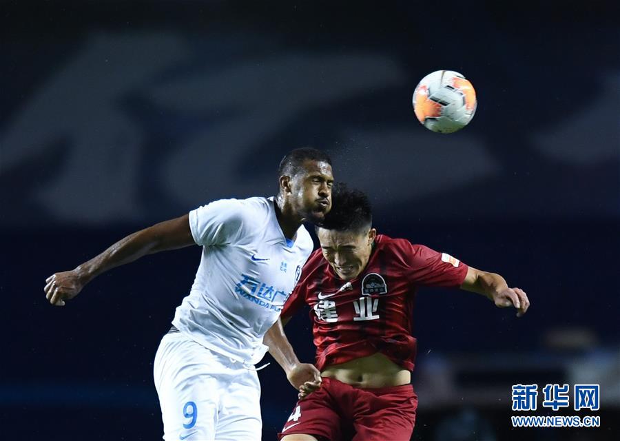 9月3日,大连人队球员龙东(左)与河南建业队球员韩轩争顶。 当日,在2020赛季中国足球协会超级联赛第一阶段(大连赛区)第九轮比赛中,大连人队以4比0战胜河南建业队。 新华社记者 龙雷 摄