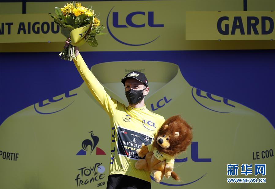9月3日,亚当·耶茨在赛后颁奖仪式上庆祝。 当日,2020环法自行车赛进行了第六赛段从阿尔代什省的勒泰伊到加尔省的艾瓜勒山的比赛,赛段全程191公里。最终,阿斯塔纳车队哈萨克斯坦车手卢岑科获得赛段冠军,米切尔顿-斯科特车队英国车手亚当·耶茨继续保有黄色领骑衫。 新华社/美联