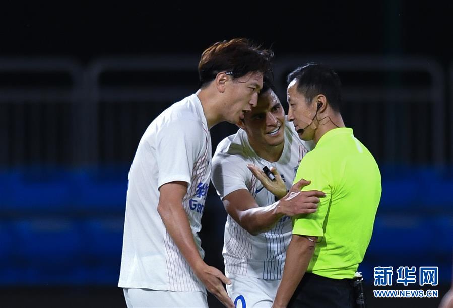 9月4日,上海绿地申花队球员杨旭(左)和莫雷诺(中)与主裁判马力交流。 当日,在2020赛季中国足球协会超级联赛第一阶段(大连赛区)第九轮比赛中,上海绿地申花队以0比0战平深圳佳兆业队。 新华社记者 龙雷 摄