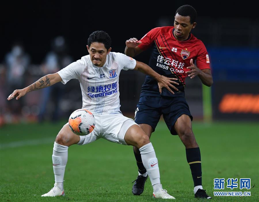 9月4日,上海绿地申花队球员钱杰给(左)与深圳佳兆业队球员普雷西亚多拼抢。 当日,在2020赛季中国足球协会超级联赛第一阶段(大连赛区)第九轮比赛中,上海绿地申花队以0比0战平深圳佳兆业队。 新华社记者 龙雷 摄