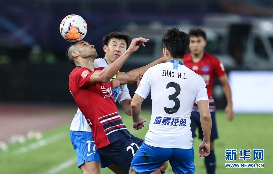 9月6日,重庆当代队球员卡尔德克(左前)在比赛中拼抢。 当日,在2020赛季中国足球协会超级联赛第一阶段(苏州赛区)第九轮比赛中,重庆当代队以2比1战胜天津泰达队。 新华社记者杨磊摄