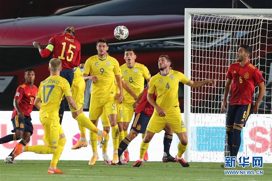 9月6日,西班牙队球员拉莫斯(上)在比赛中头球攻门。 当日,在西班牙马德里举行的欧洲国家足球联赛A级第四组第二轮比赛中,西班牙队主场以4比0战胜乌克兰队。 新华社发(爱德华·皮特斯摄)