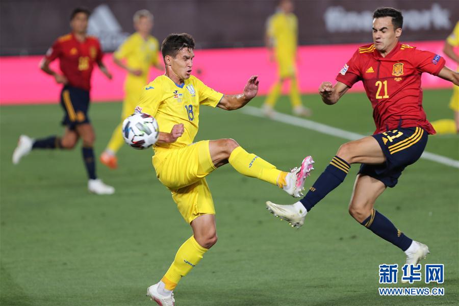 9月6日,西班牙队球员雷吉隆(右)与乌克兰队球员蒂姆丘克在比赛中拼抢。 当日,在西班牙马德里举行的欧洲国家足球联赛A级第四组第二轮比赛中,西班牙队主场以4比0战胜乌克兰队。 新华社发(爱德华·皮特斯摄)