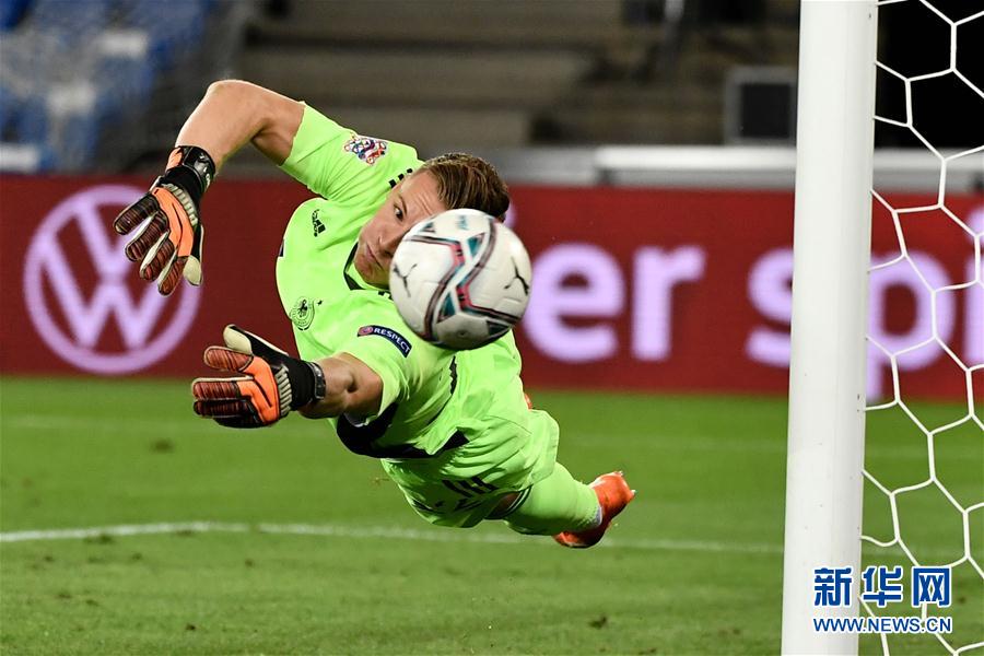9月6日,德国队门将莱诺在比赛中扑救。 当日,在瑞士巴塞尔进行的2020欧洲国家足球联赛A级第四组第二轮比赛中,德国队客场以1比1战平瑞士队。 新华社/法新
