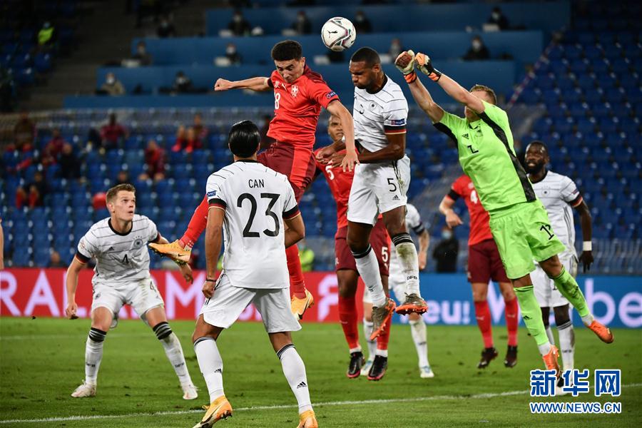 9月6日,瑞士队球员巴尔加斯(上左)与德国队球员乔纳森·塔(上中)在比赛中争抢头球。 当日,在瑞士巴塞尔进行的2020欧洲国家足球联赛A级第四组第二轮比赛中,德国队客场以1比1战平瑞士队。 新华社/法新