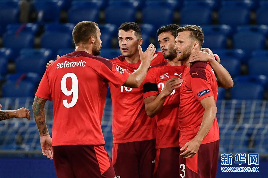 9月6日,瑞士队球员威德默(右)与队友在比赛中庆祝进球。 当日,在瑞士巴塞尔进行的2020欧洲国家足球联赛A级第四组第二轮比赛中,德国队客场以1比1战平瑞士队。 新华社/法新