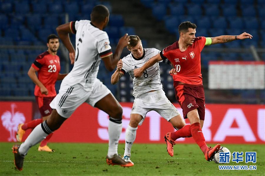 9月6日,瑞士队球员扎卡(右一)与德国队球员克洛斯(右二)在比赛中拼抢。 当日,在瑞士巴塞尔进行的2020欧洲国家足球联赛A级第四组第二轮比赛中,德国队客场以1比1战平瑞士队。 新华社/法新